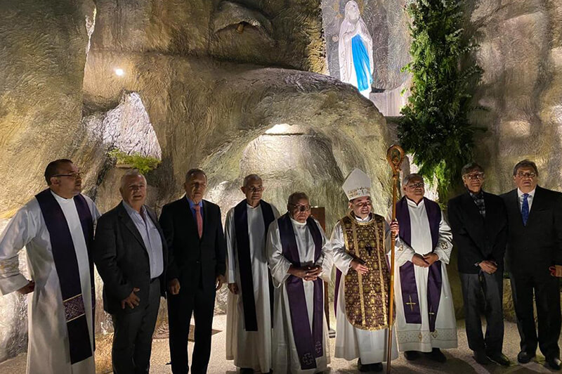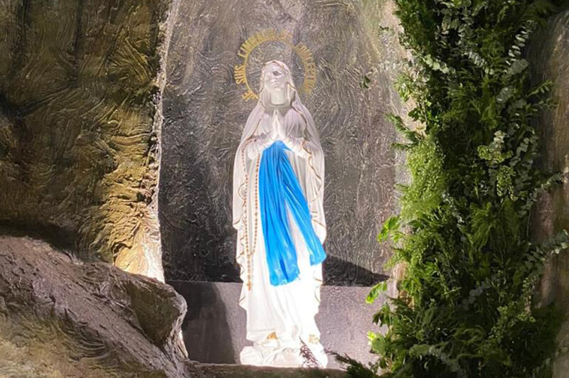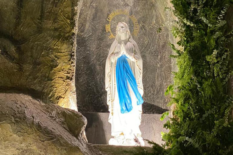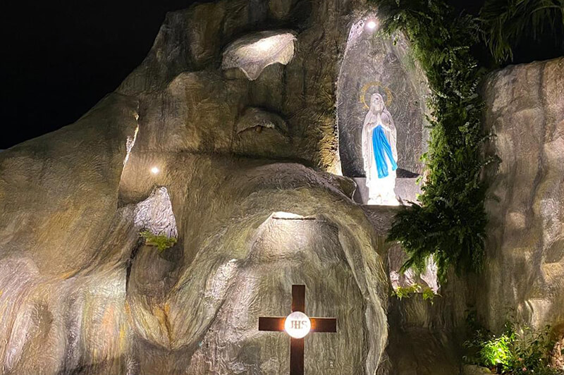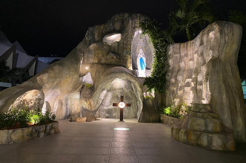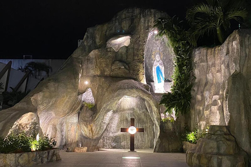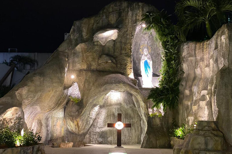 Buscando una sobriedad de iluminación, se apoyó a la parroquia de Nuestra Señora de Lourdes ubicada en la colonia Petrolera. En este proyecto rediseñamos su gruta donde tienen ubicada la imagen de la virgen; la recomendación general fue manejar tonos cálidos y de cortesía para enfatizar las delicadas líneas curvas logrando así un realce natural tanto en su decoración artificial como en la natural.